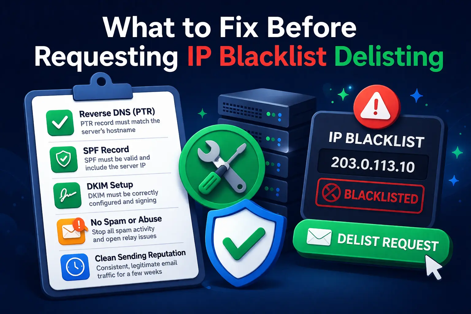 After fixing reverse DNS, tightening authentication, cleaning the recipient list, and slowing sending volume, the delisting request has a much better chance of sticking.